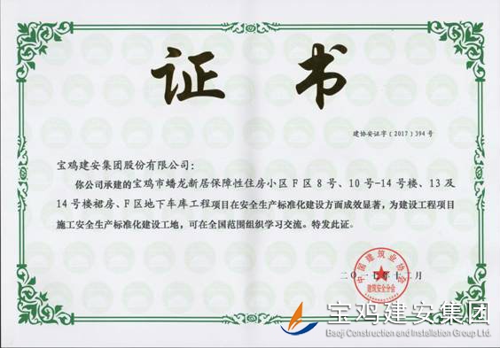 “建設工程項目施工安全生產標準化工地”是由中國建筑業(yè)協會建筑安全分會在全國范圍內組織開展的大型評選活動,是建設部批準的全國安全文明施工方面的最高獎項,被業(yè)內譽為安全文明施工方面的“魯班獎”。此項評選嚴格遵照“控制數量、嚴格程序、規(guī)范行為、爭創(chuàng)品牌”的原則,旨在規(guī)范施工安全生產工作,保障建筑職工生命安全與健康,被納入到企業(yè)誠信評價綜合標準。該項榮譽的獲得,表明我公司的安全文明施工管理水平更上新臺階,得到了主管部門、上級領導的高度肯定。 此次“建設工程項目施工安全生產標準化工地”評選中,在陜西省近百家企業(yè)的激烈競爭中僅有15家企業(yè)獲此殊榮。我公司能在如此激烈的競爭中脫穎而出,是因我公司在該工程施工過程中,項目安全、質量、進度、環(huán)境保護、企業(yè)文化建設齊頭并進,且始終將施工安全生產標準化建設貫穿在施工全過程進行嚴控。該榮譽的獲得,為我司安全生產標準化建設樹立了標桿。 該項目還榮獲獲“寶雞市市級文明工地”、“陜西省省級文明工地” 、“陜西省建筑優(yōu)質結構工程”、“陜西省建筑業(yè)綠色施工示范工程”稱號,且于2016年6月召開寶雞市文明工地現場觀摩會。歷經近兩年半的精心建設,該工程已進入后期裝飾裝修施工階段,工程建設得到了當地政府和群眾的高度贊譽。 一分耕耘一分收獲,累累碩果見證我公司的榮耀。所有的建安人將懷揣進取不止、追求品質的夢想,用進取和務實為企業(yè)的安全發(fā)展,再添輝煌。
