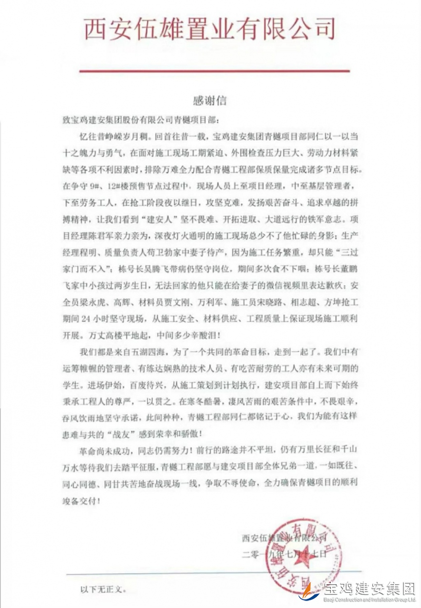 2019年7月17日,我公司路橋項(xiàng)目部承建的中南青樾項(xiàng)目收到由建設(shè)單位西安伍雄置業(yè)有限公司發(fā)出的一封感謝信,信中言辭懇切,對路橋公司青樾項(xiàng)目管理人員給出了極高的評價。在面對施工現(xiàn)場工期緊迫、資金短缺、外圍檢查壓力巨大、勞動力材料緊缺等各項(xiàng)不利因素時,寶雞建安集團(tuán)青樾項(xiàng)目部各位同仁克服自身困難、艱苦奮斗、不畏艱難以一當(dāng)十之魄力與勇氣保質(zhì)保量并按工期節(jié)點(diǎn)完成了施工任務(wù)。