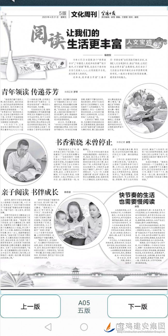 編者按:在第28個(gè)世界讀書日到來(lái)之際,《寶雞日?qǐng)?bào)》社策劃了讀書專版,鑒于寶雞建安集團(tuán)工會(huì)長(zhǎng)期堅(jiān)持舉辦的“書香企業(yè)”征文活動(dòng)在社會(huì)的影響力與美譽(yù)度,記者來(lái)電提出采訪意向,公司工會(huì)極力舉薦了來(lái)自基層一線熱愛(ài)閱讀并多次參與讀書征文的技術(shù)人員張振東同志。5月21日,《寶雞日?qǐng)?bào)》發(fā)表了這篇小專訪,現(xiàn)予轉(zhuǎn)發(fā)。